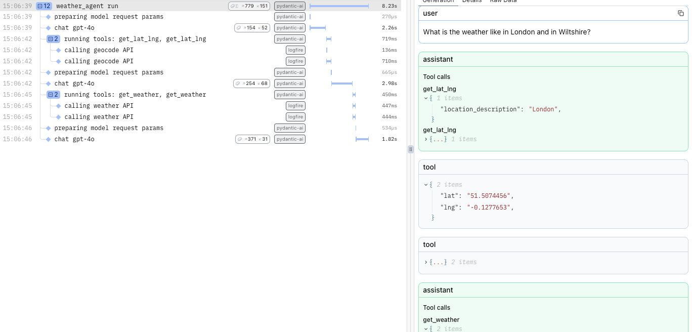 To demonstrate how Logfire can let you visualise the flow of a PydanticAI run, here's the view you get from Logfire while running the chat app examples: